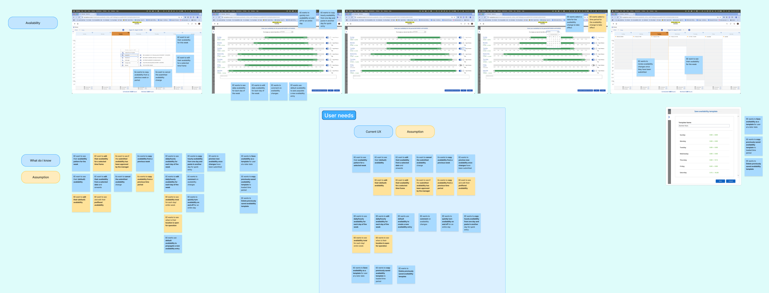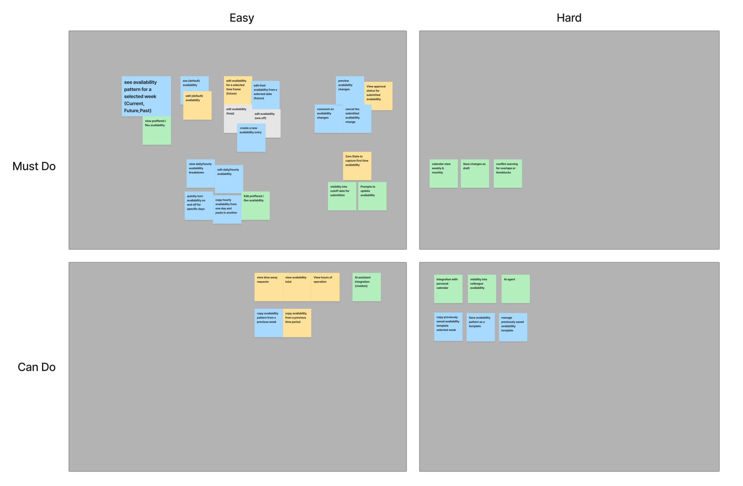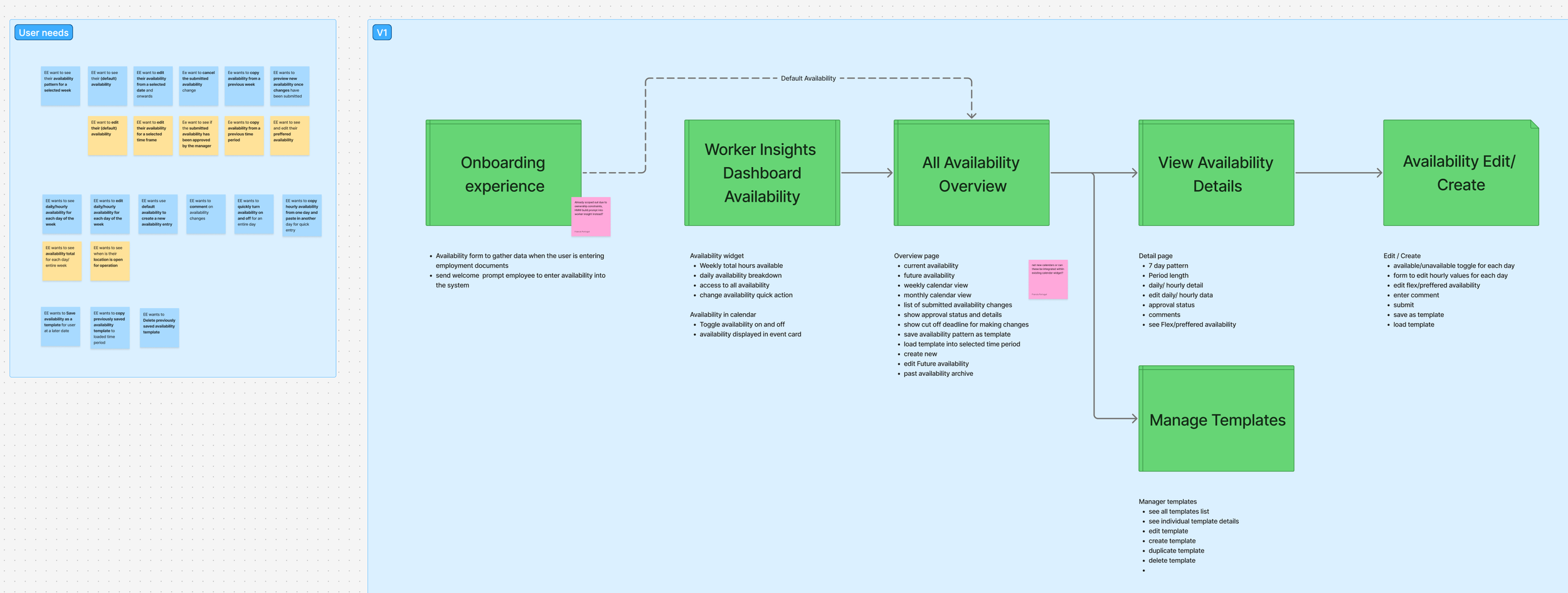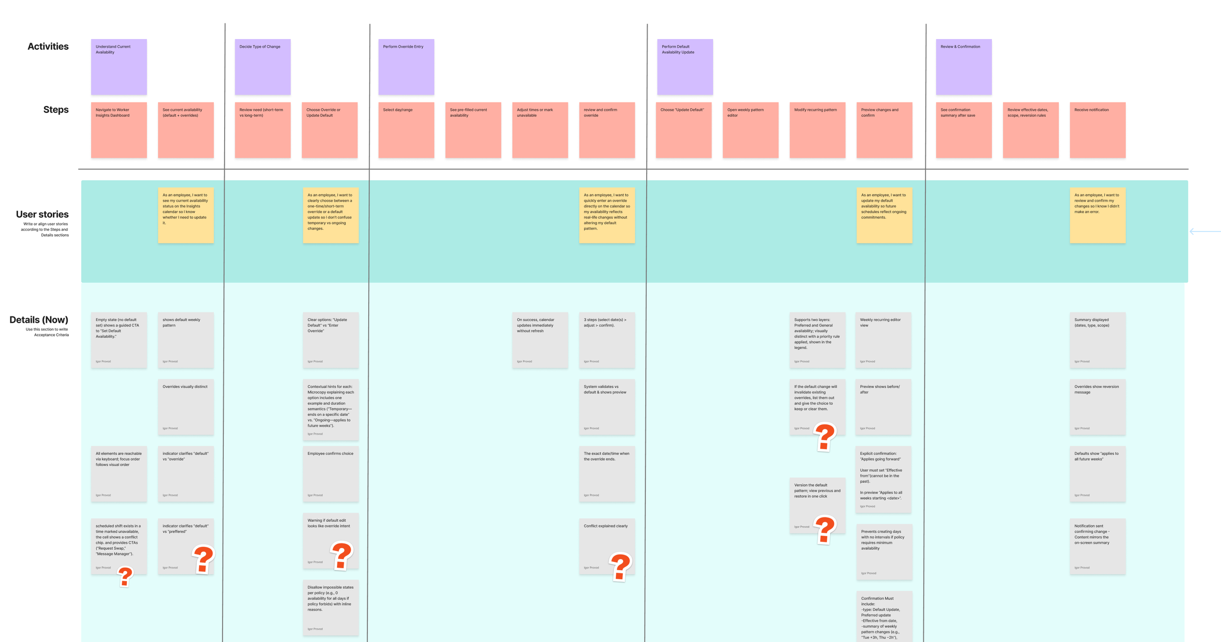 I presented these findings to our product team and wrote a structured product brief that defined the feature's intent: enable employees to view, edit, submit, and manage their availability in a way that's intuitive, flexible, and efficient — while keeping them informed about approval status, shift alignment, and location hours.
