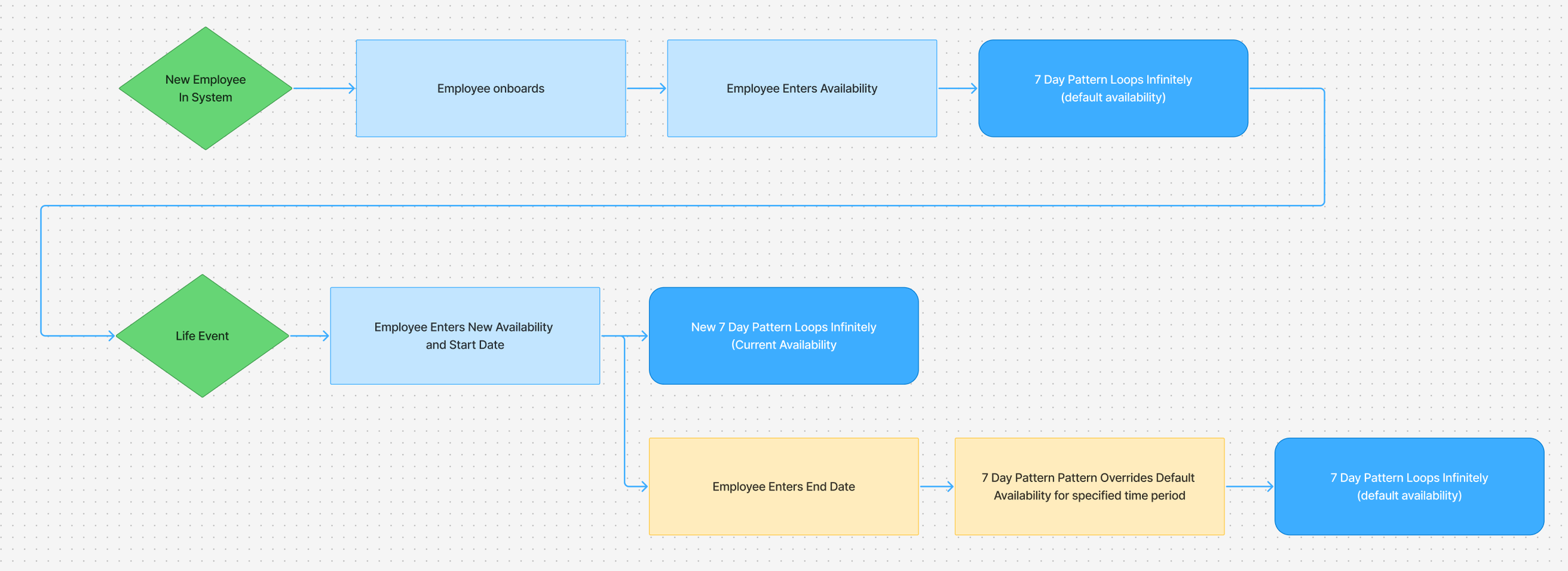 Default Availability: This is the repeating weekly pattern — the baseline that tells the system "this is when I'm generally available." Because defaults repeat week after week (or follow a multi-week rotation), the entry flow is structured around a weekly template. Employees can set their default, and the calendar reflects it across future weeks automatically.