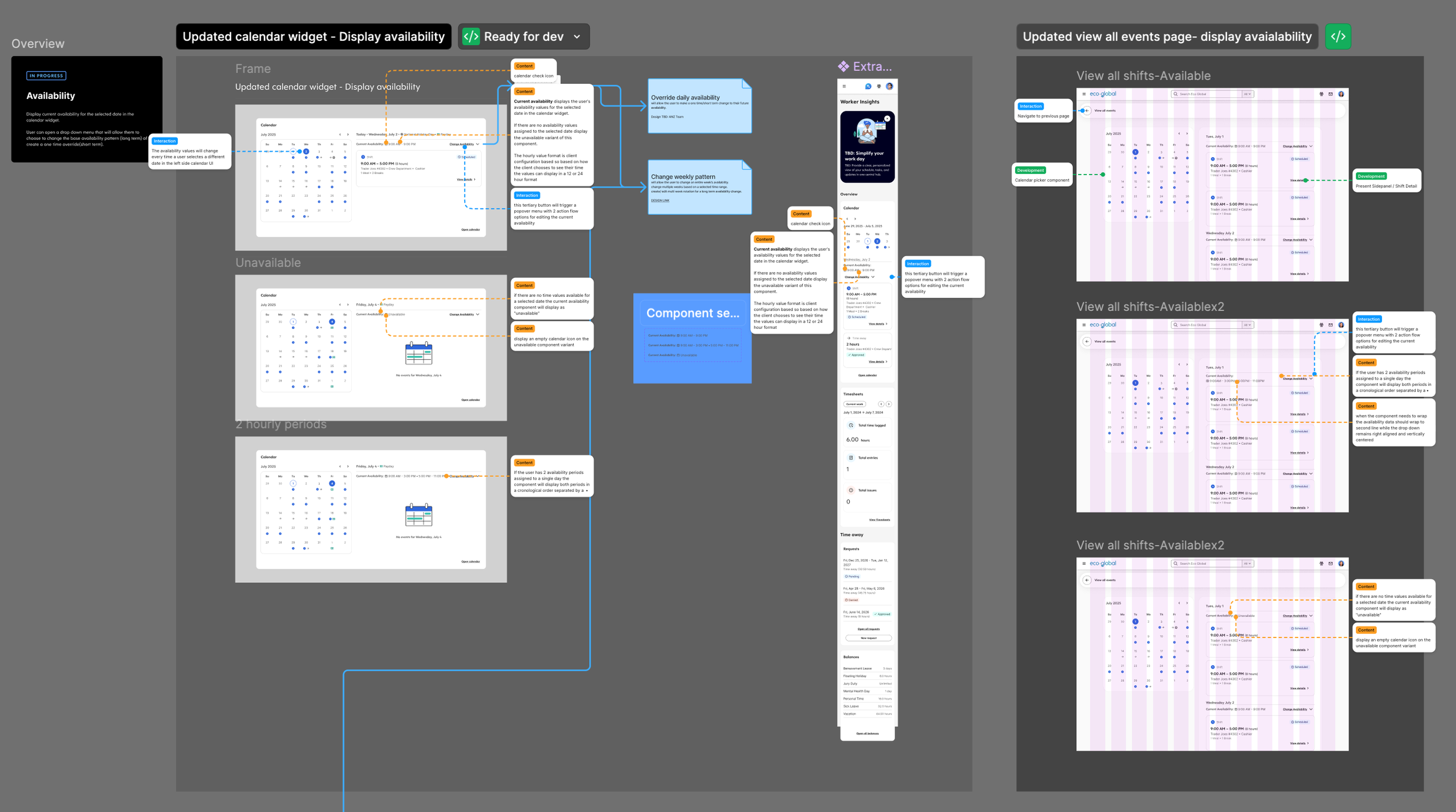 The design centers on a calendar widget— not a weekly grid, but a full calendar view showing daily availability. The calendar widget was a pre-existing design pattern in the Everest design system, and I needed to leverage it in my design exploration. The calendar which pattern was limited in the way that it would display daily information. The user needed to select a specific date to be able to see any relevant information (availability, scheduled shifts, PTO requests, stat holidays) for the selected date. Once the user was able to see their availability for the selected date, they also had an affordance that allowed them to make changes to their current and future availability.
