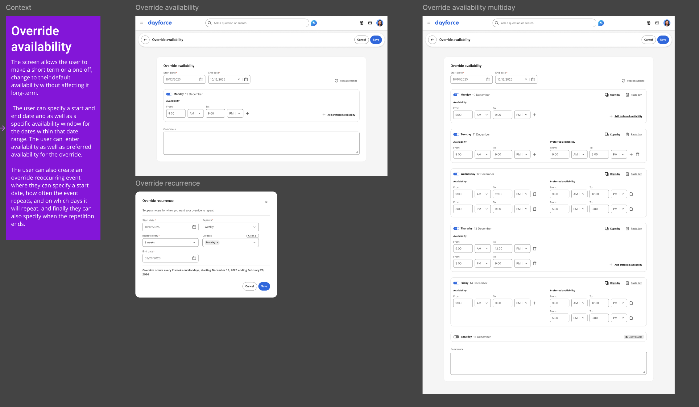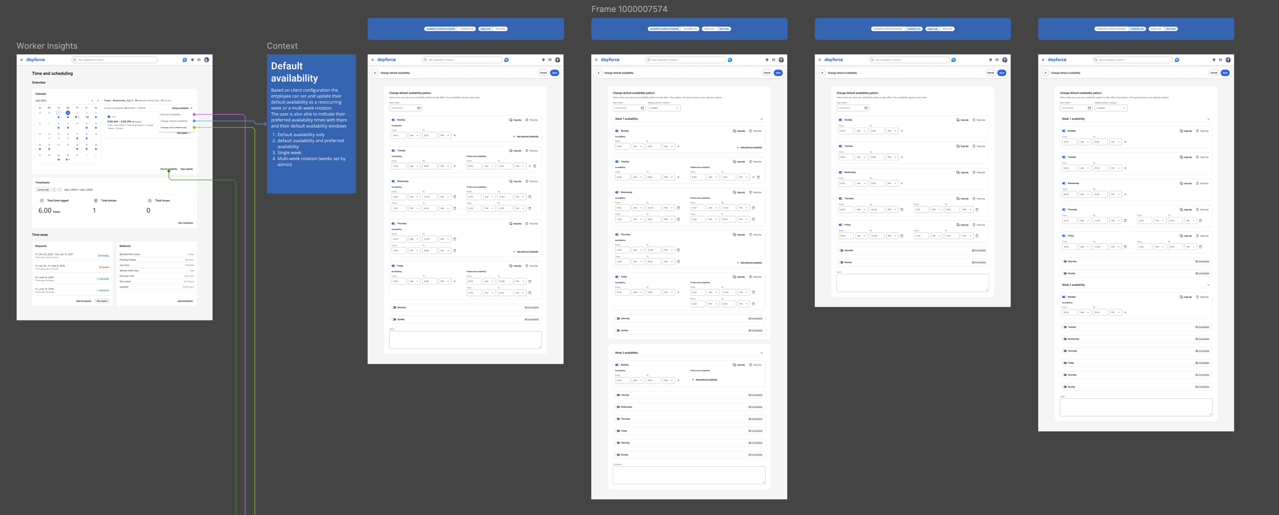The research gave me a clear stance: availability management needed to handle the full range of what employees actually do — not just the default weekly pattern, but one-off changes, temporary overrides, shift preferences, and the ability to see everything in context.