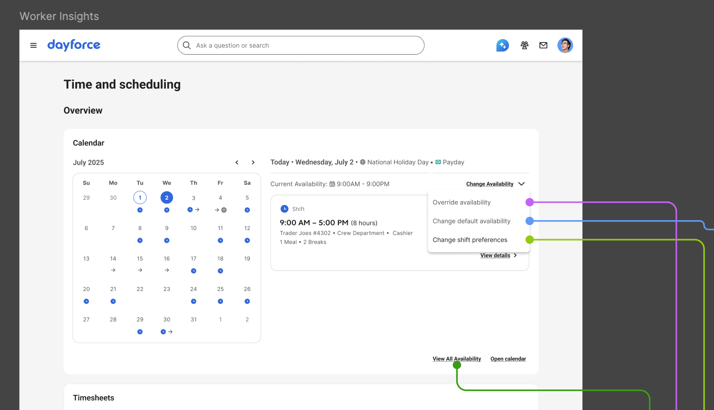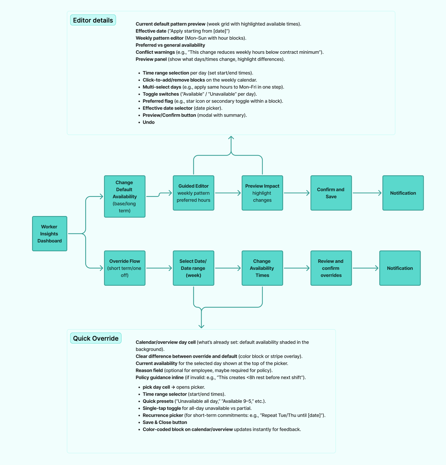 Flexibility over rigidity. The research showed that availability isn't a fixed weekly pattern for most people. It shifts with school schedules, second jobs, family obligations, and seasonal changes. The four-flow structure (default, override, view all, preferences) was designed to accommodate that reality without forcing employees to learn a complex system — each flow handles one type of change, and the calendar ties them together.