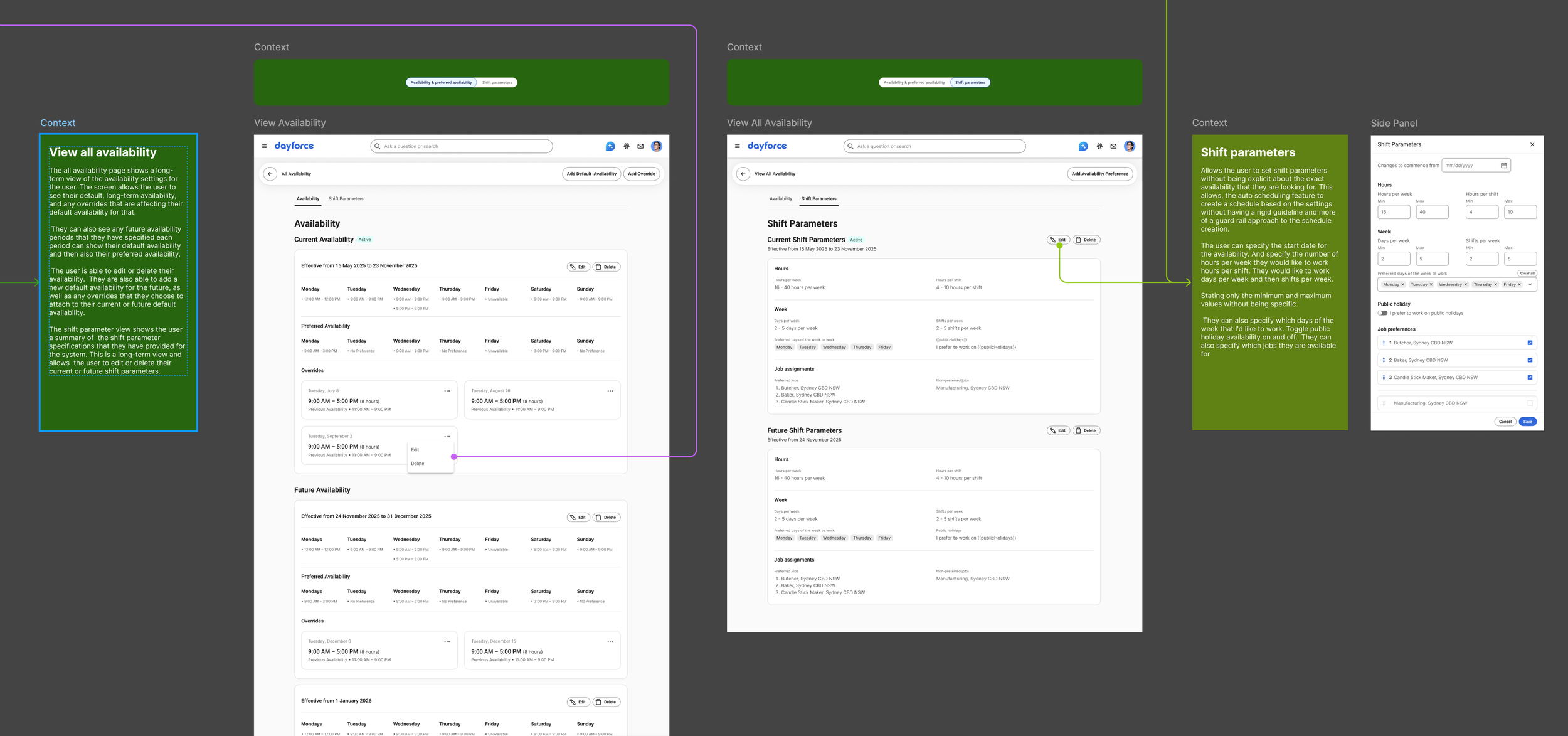 View all availability — comprehensive breakdown with current, overrides, and future availability, preferred shift options.