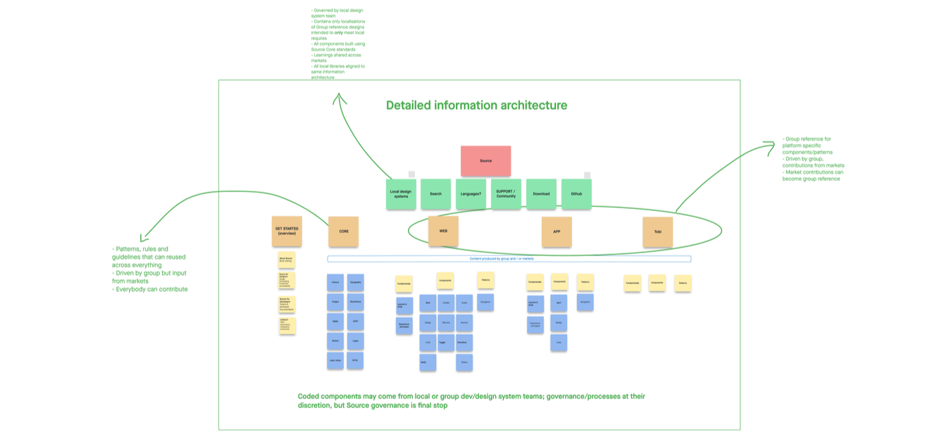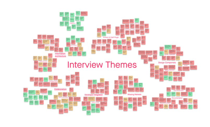 I ran a full audit of the existing library alongside interviews with designers, developers, and product leads across multiple markets. The research was synthesised using affinity mapping — colour-coded insights from individual stakeholders were clustered into emerging themes, then refined into a consolidated set of interview themes that revealed systemic patterns rather than isolated complaints. What surfaced wasn't a single failure point — it was a compounding set of them: components named inconsistently between design and engineering, an information architecture that had grown organically without governance, redundant variants that had proliferated as teams built workarounds rather than contributing back, and no clear ownership model to prevent the same drift from recurring.