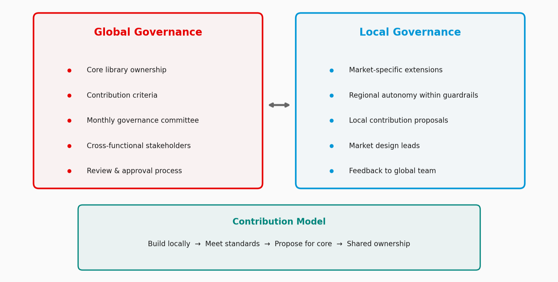 The contribution model was designed to turn market teams from consumers into co-owners. When a team built something locally that met system standards, there was now a clear path to propose it for the core library. This shifted the incentive structure: instead of building workarounds privately, teams had a reason to build to a shared standard.